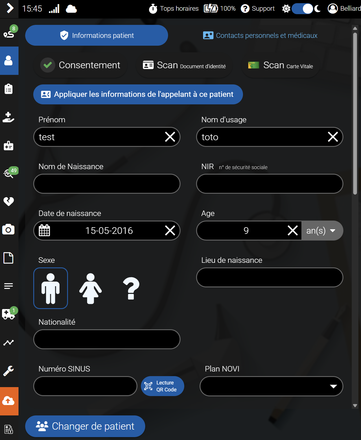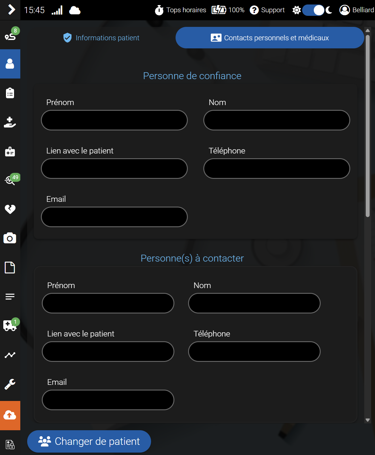 Le bouton « Changer de patient » permet d'ajouter un patient durant l'intervention ci-cela est nécessaire.