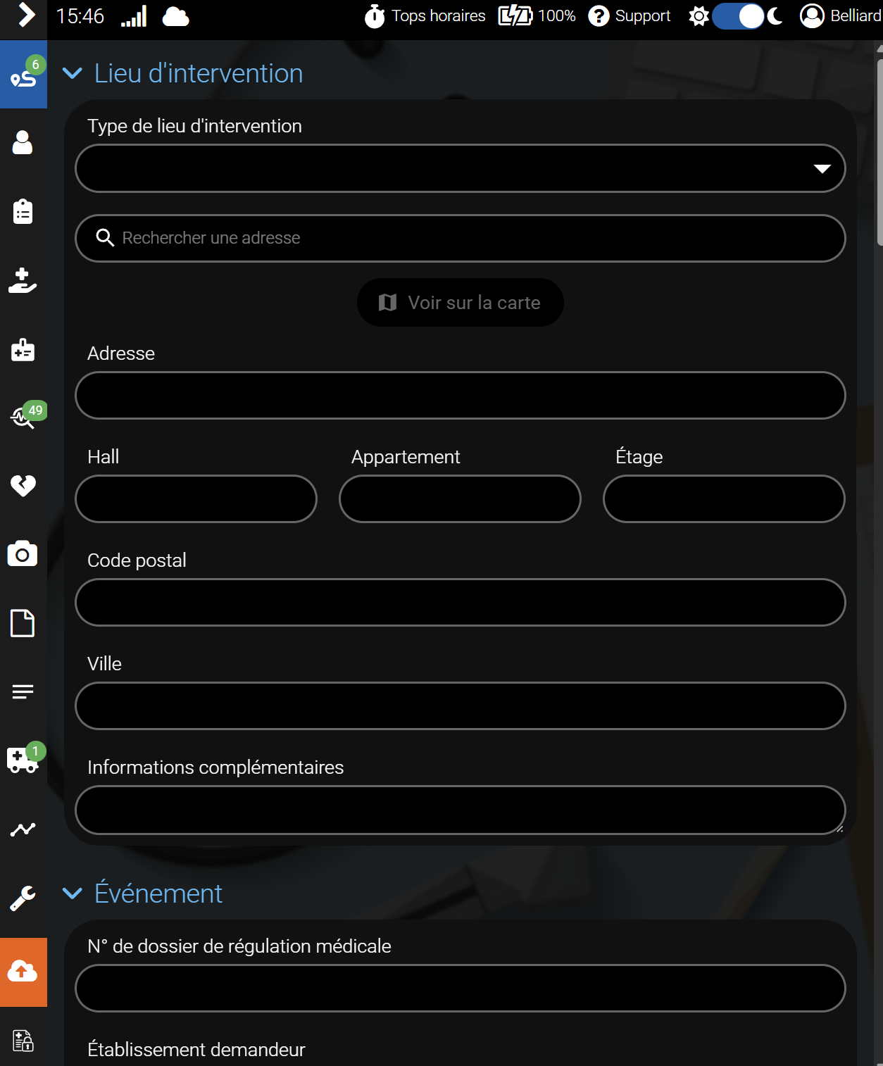 Cette section est composée de différentes sections : le lieu d'intervention, l'événement, l'appelant et le déclenchement SMUR.