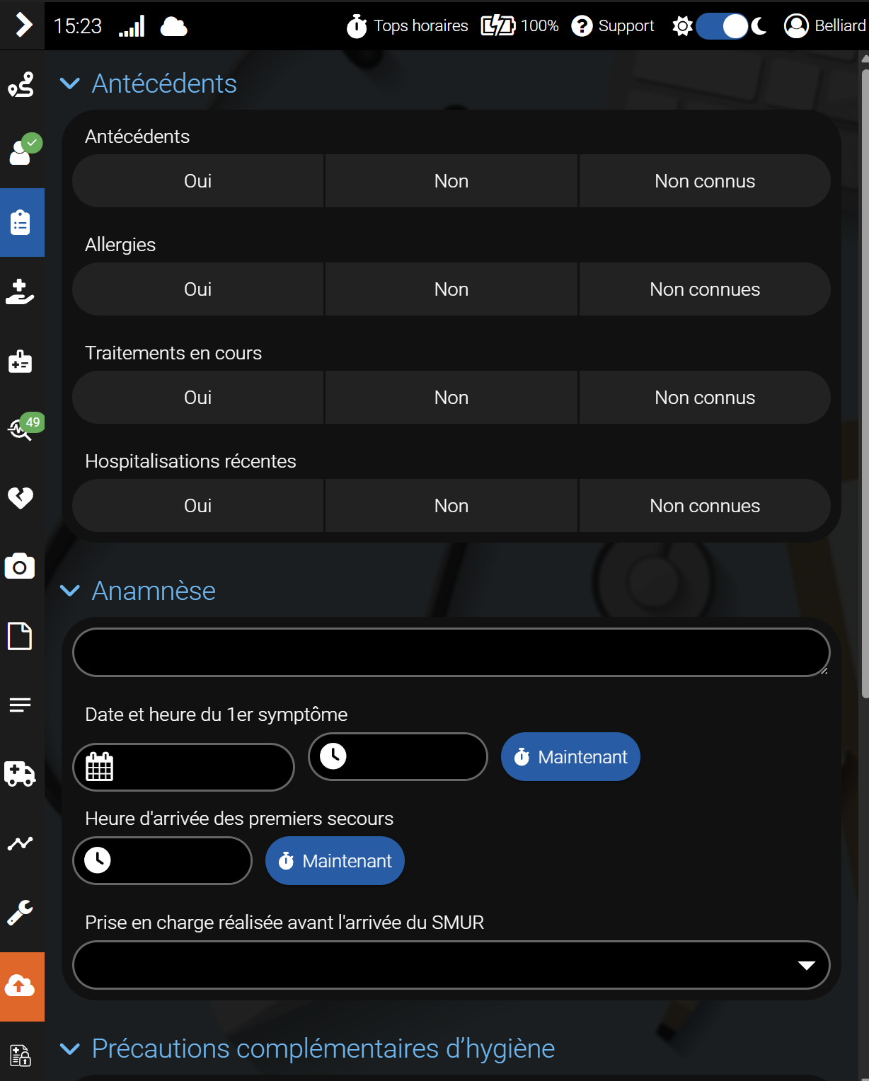 Dans la section "Anamnèse", l'heure du premier symptôme peur être ajouté si vous cliquez sur "Maintenant"