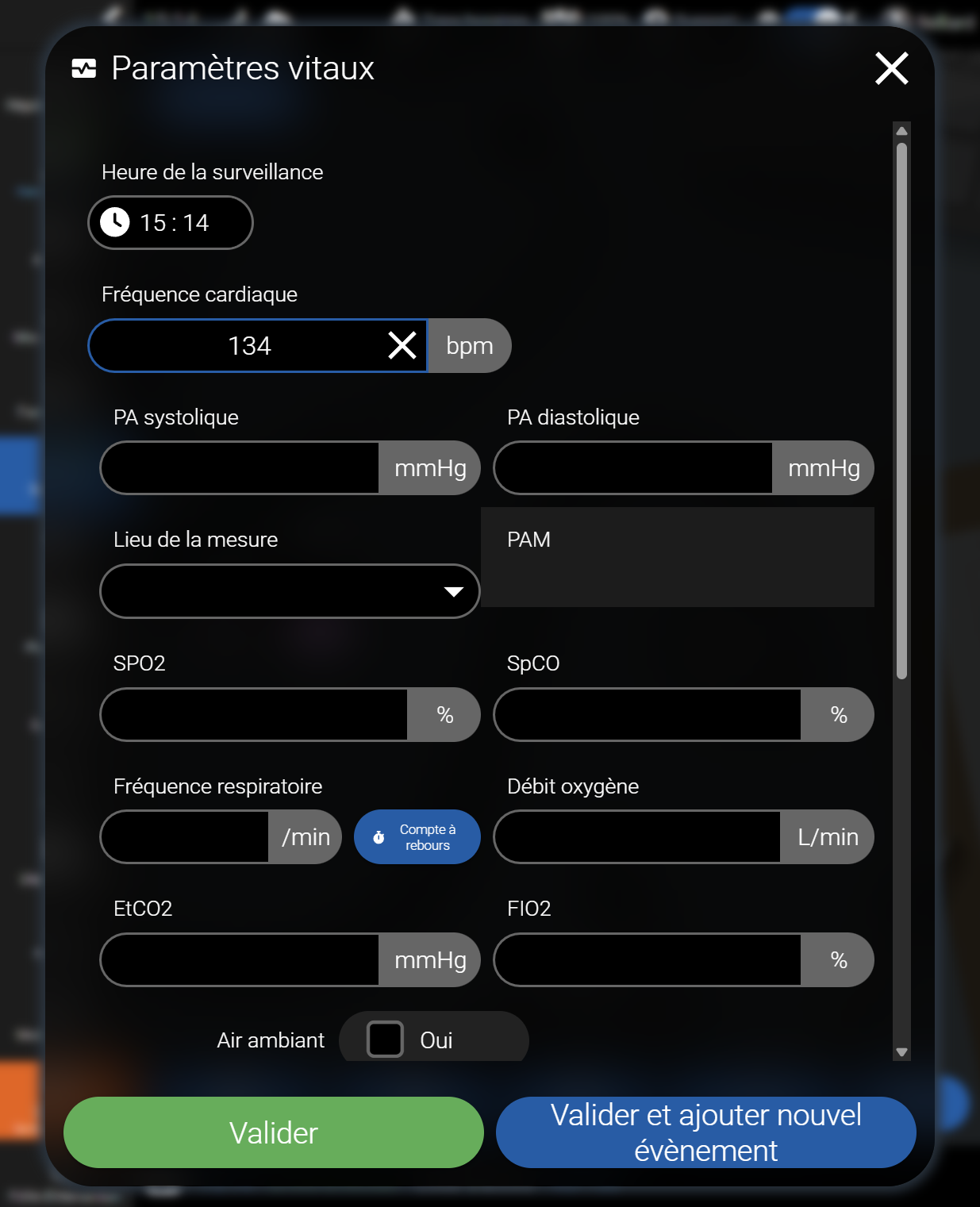 Cette section rassemble les paramètres vitaux que l'utilisateur peut renseigner (FC, PAS, PAD, PAM, Glasgow, échelle de la douleur, etc.).