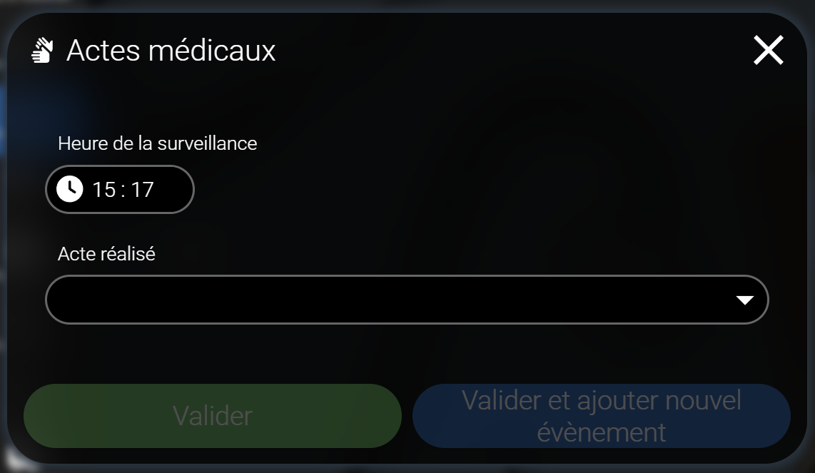 Cette section rassemble les actes médicaux que l'utilisateur peut renseigner (Abord du thorax, ECG, ventilation, etc.) ainsi que le choix de la personne qui a réalisé l'acte.