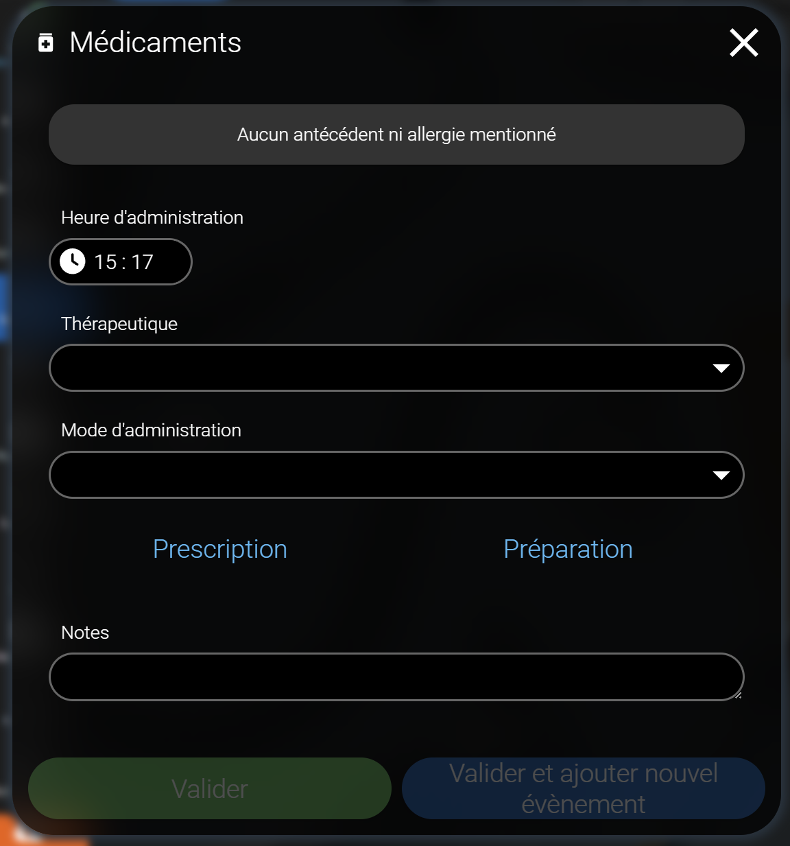 Cette section permet d'ajouter des médicaments ainsi que le choix de la personne qui a réalisé l'acte.