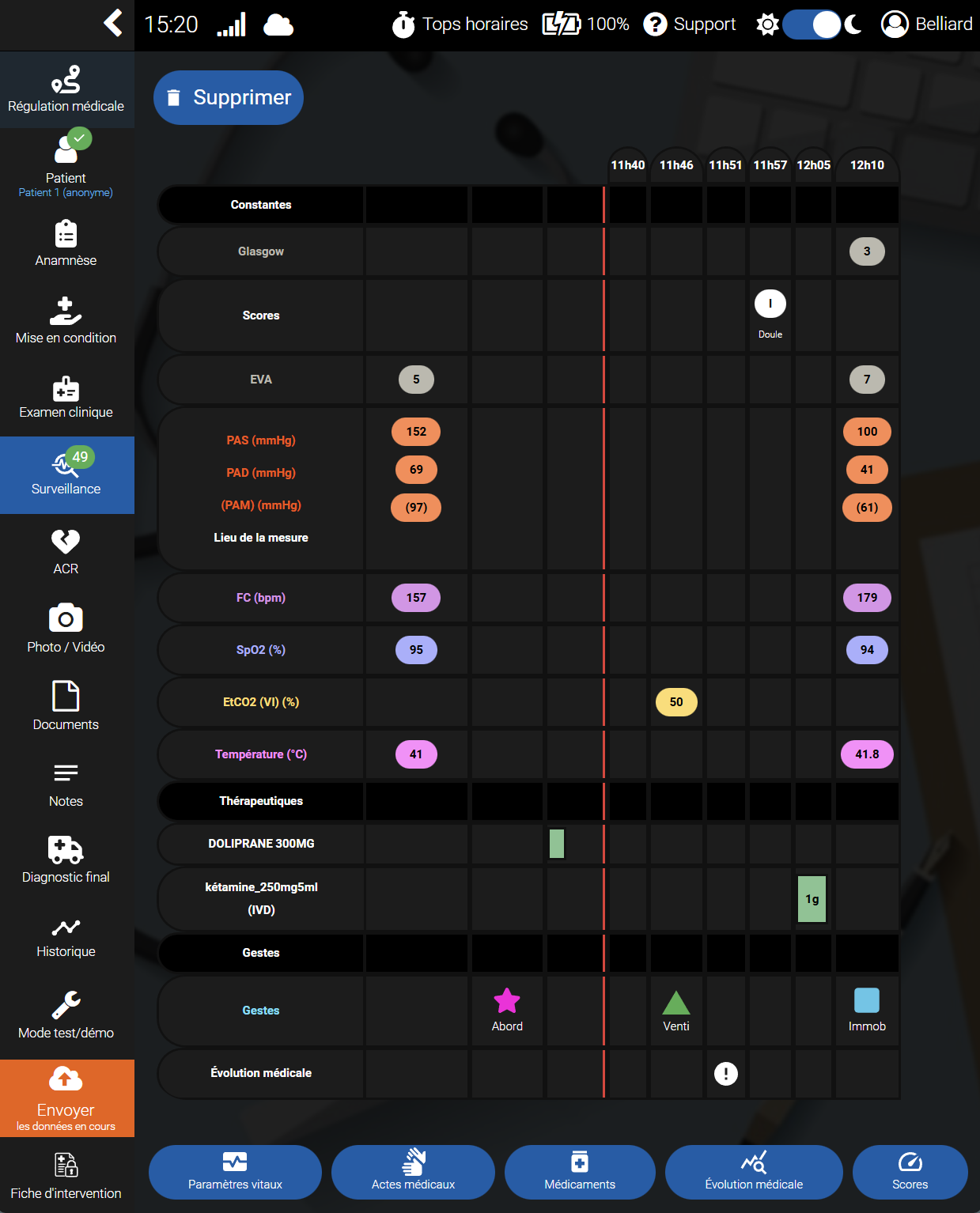 Le tableau de surveillance regroupe les données issues des pages "Mise en condition", "Examen clinique" et "Surveillance". Les données sont affichées dans un tableau en ligne du haut les heures de surveillance et la colonne de gauche pour le nom des données.