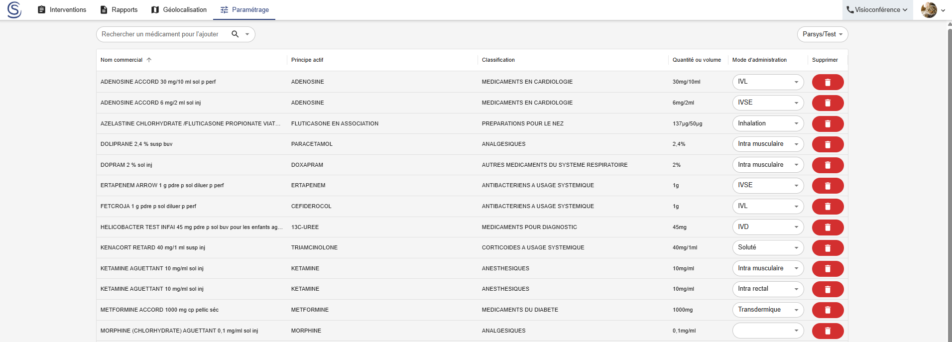 Depuis l’interface web du Cloud Parsys, un onglet Paramétrage permet de gérer les médicaments disponibles dans l’application tablette de chaque établissement.